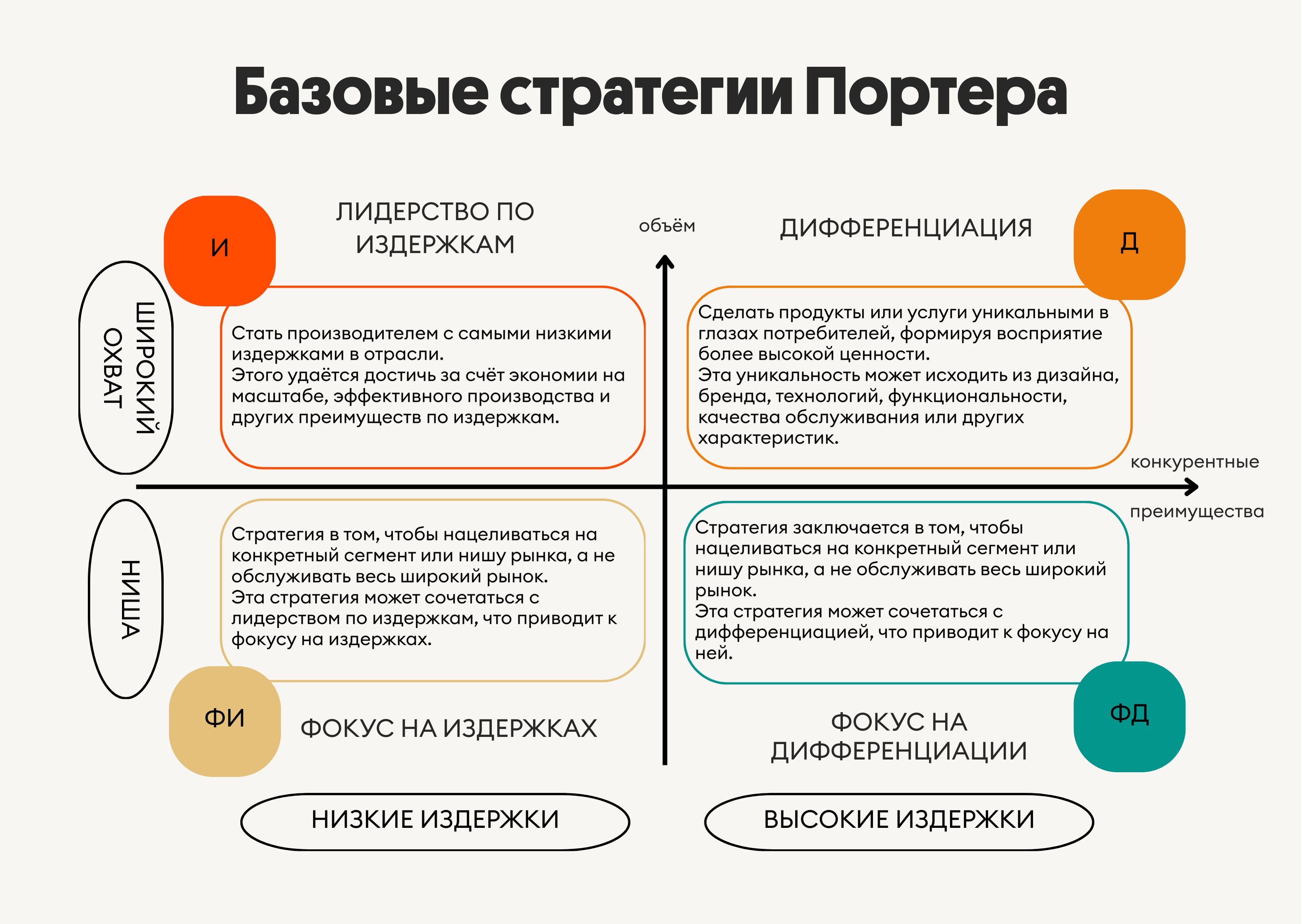 В этой статье мы подробно рассмотрим четыре основные стратегии Портера — Лидерство по издержкам, Дифференциацию, Фокус на издержках и Фокус на дифференциации. Мы разберём, что включает в себя каждая из них, и приведём примеры компаний, которым удалось успешно применить эти подходы на практике.